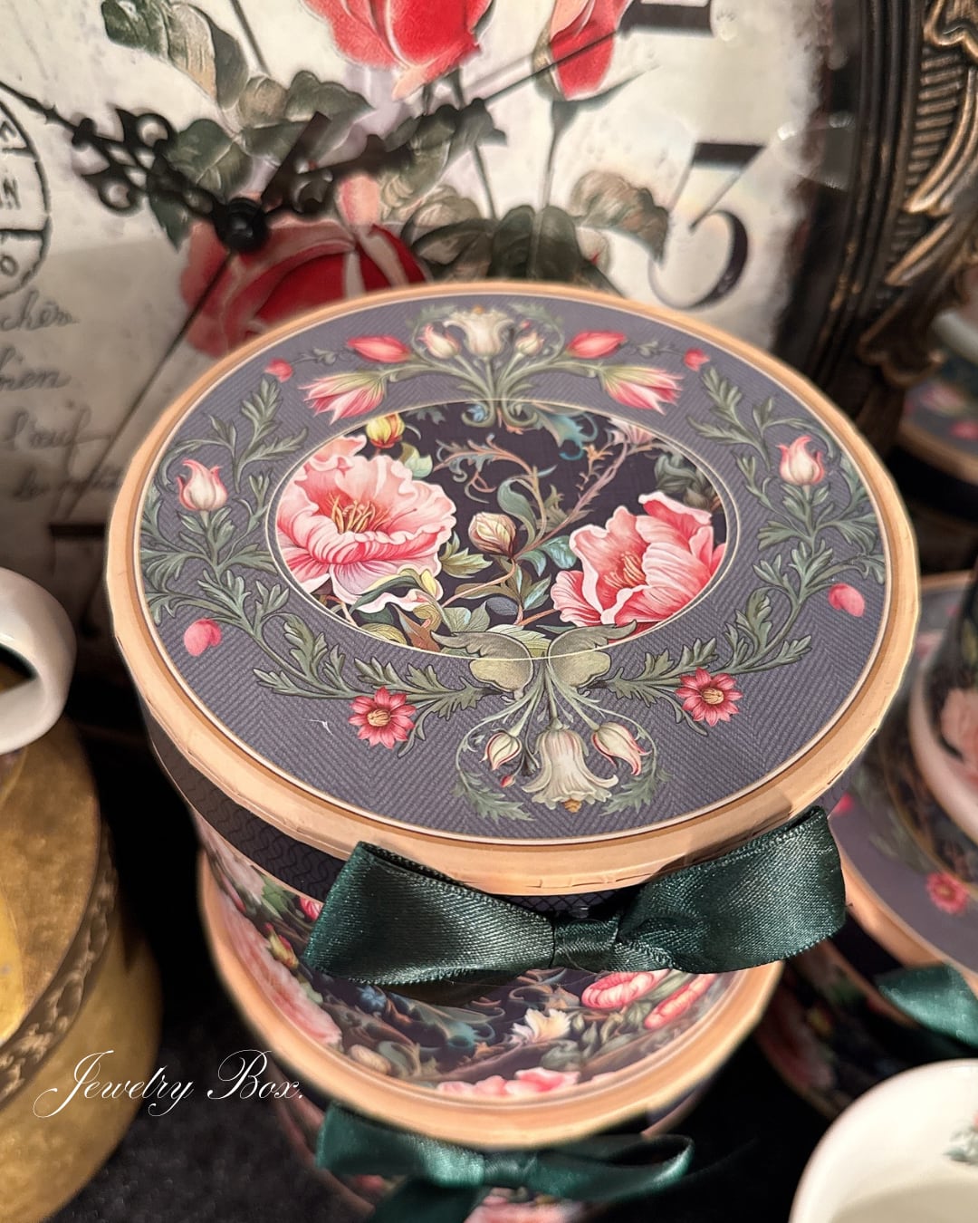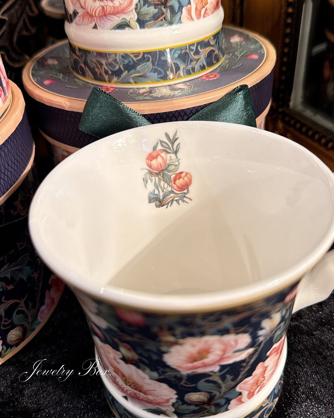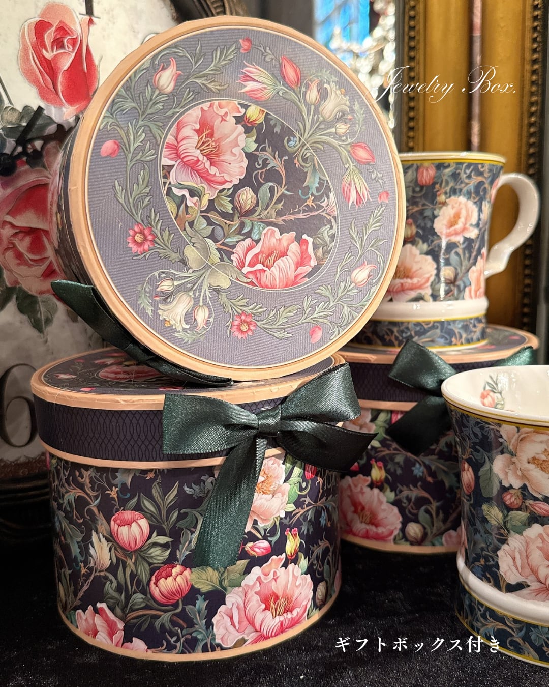 柔らかく優美な花柄が印象的なマグカップと専用ボックスのセットです。