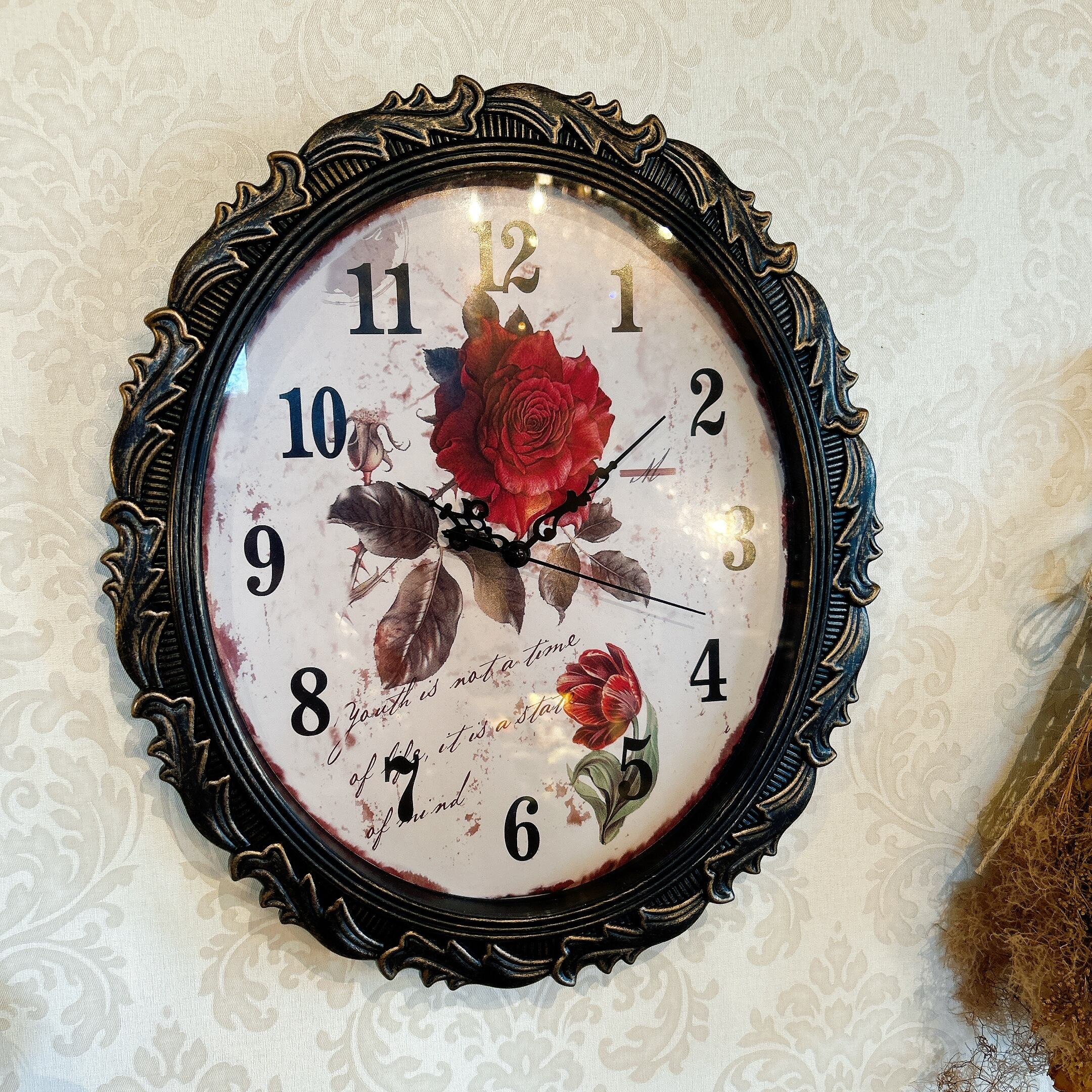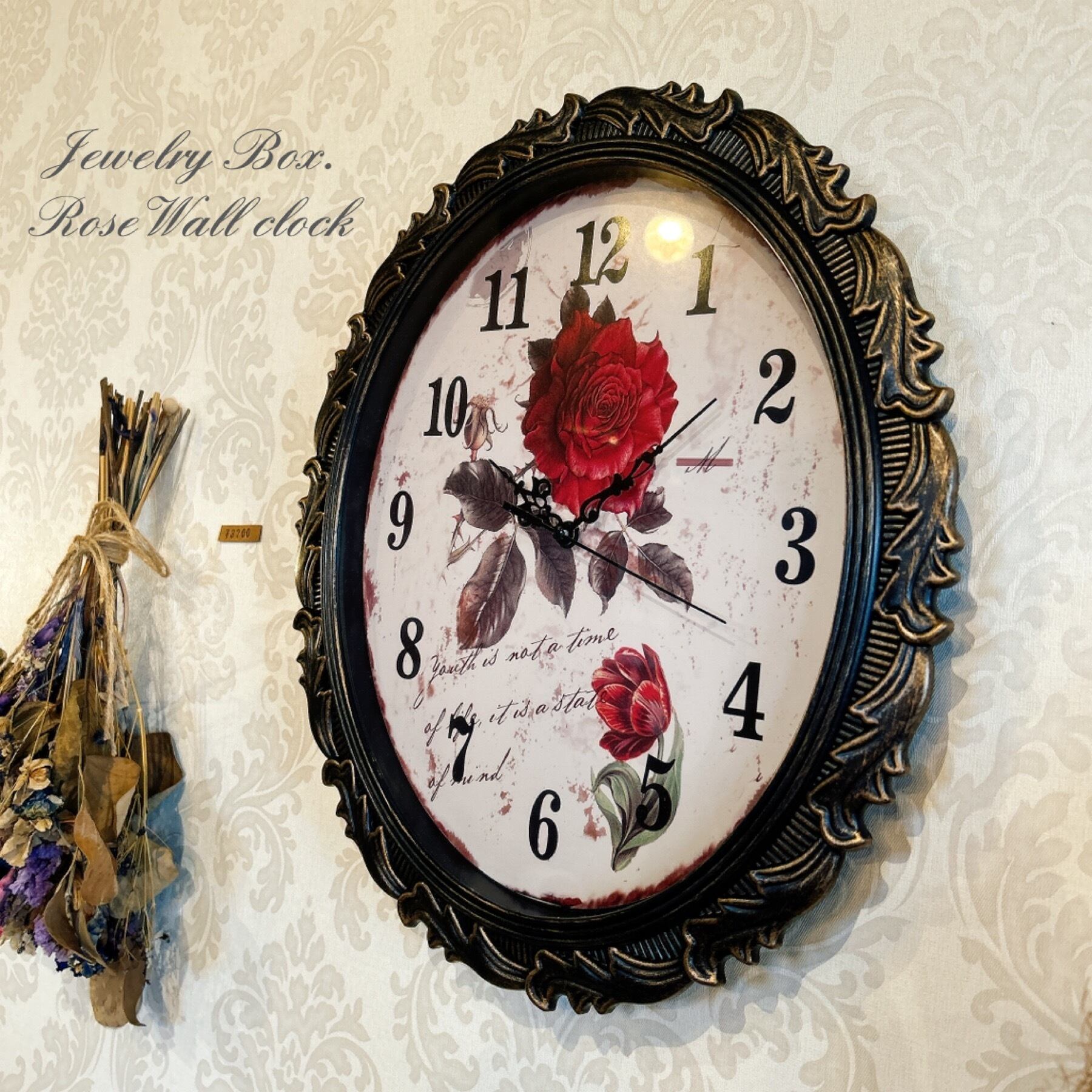 アンティーク調の壁掛け時計です。 真っ赤なオールドローズや英字がとても美しい逸品です。 サイズ: 33×38cm 単三電池は付属しておりません。 縁部分:プラスチック 時計版:ガラス