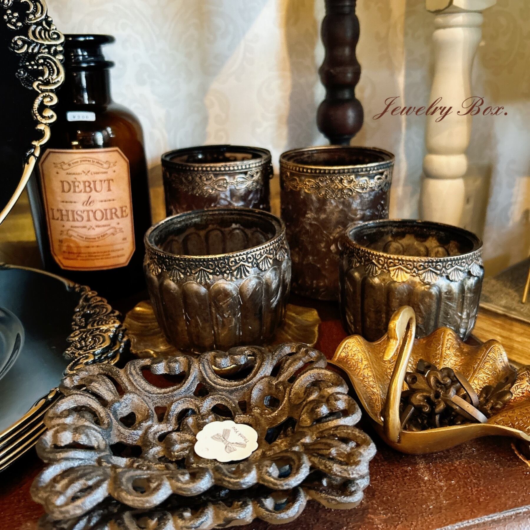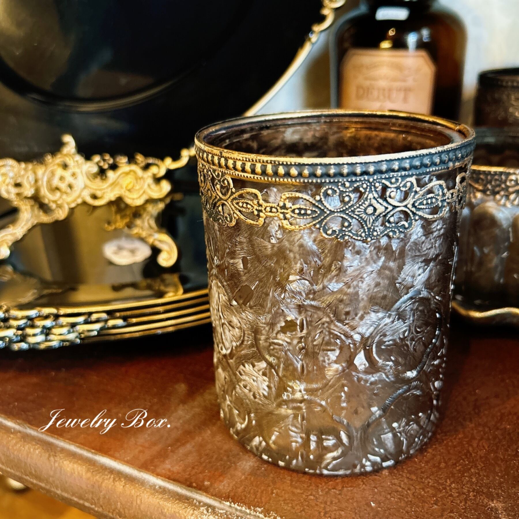アンティーク加工が施されたフラワーベース。 花瓶としてはもちろん ペン立てや小物入れなど用途はさまざま。 サイズ: Φ10cm 高さ 約12cm 素材: ガラス